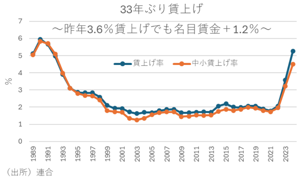 岸田政権は、政権発足当初から「賃金と物価の好循環」を目標として掲げてきた。そして、その実現に向けて積極的に施策を展開しているとされており、2024年の春闘賃上げ率は33年ぶりの水準となった。具体的には33年ぶりに5%を超え、30年ぶりの水準となった昨年を1.5%ポイント程度上回っている。これによって、早ければ今夏にも実質賃金がプラスに転じることが期待されており、6月給与分から開始される定額減税とも相まって、個人消費の拡大を期待する向きもある。