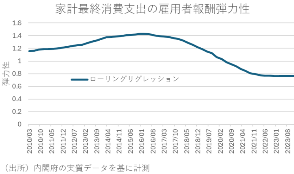 しかし、マクロで見た実質家計支出の、マクロで見た実質賃金となる実質雇用者報酬に対する弾力性を時系列で計測すると、2016年以降低下していることがわかる。