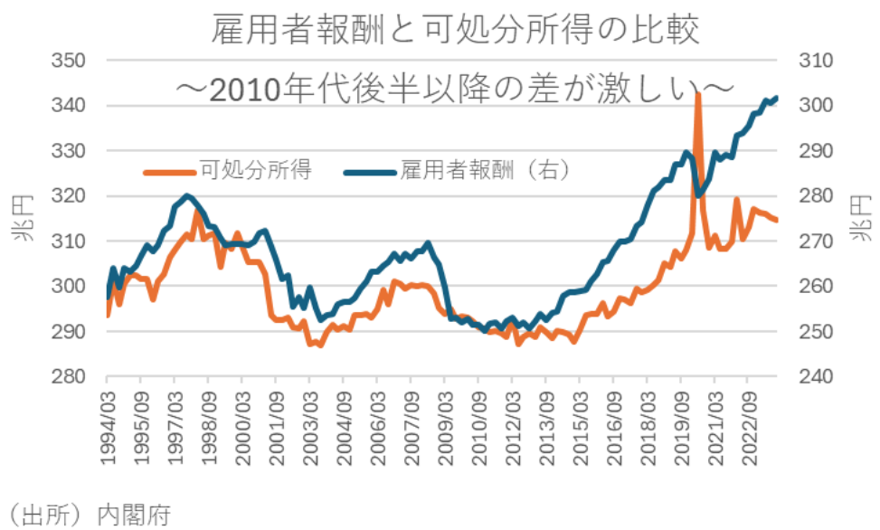 - 理由としては、先進国でも断トツの国民負担率の上昇で雇用者報酬が増えているほど可処分所得が増えていないことがある。また、無職世帯比率の増加も一因。むしろ世帯の3分の1以上を占める無職世帯にとってみれば、賃金と物価の好循環が進めば進むほど公的年金のマクロ経済スライド制により受給額が減ることになる。