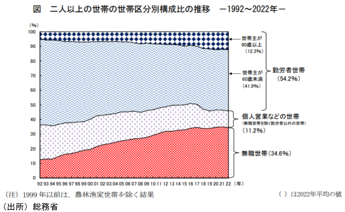 また、無職世帯比率の増加も一因だろう。というのも、総務省の家計調査によれば、二人以上世帯に占める無職世帯の割合は30年前の10%代前半から直近では34%を超えていることがわかる。また、こうした無職世帯のうち大部分が公的年金受給者であるが、年金受給額はマクロ経済スライドにより、賃金と物価の好循環が進む中では自動的に実質の受給額が減る仕組みになっている。