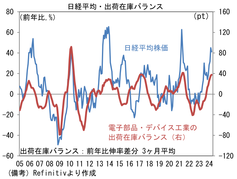 株式市場と関連の深い電子部品・デバイス工業の生産に目を向けると、4月の生産は前月比▲0.7%と回復が足踏みしたものの、前年比では+11.8%とプラス幅拡大。この間、世界半導体売上高はAI向け半導体の爆発的需要をよそに、ノートPCやスマホの需要が力強さを欠いていることから、前サイクルの頂点よりも低い水準に甘んじているが、そうした下でも本邦企業においては、在庫調整が進展したことで製品需給は引き締まる方向にある。生産計画は5月が前月比+5.8%、6月が同▲5.2%と控え目だが、もう少し長い目でみれば、増産が見込まれる。