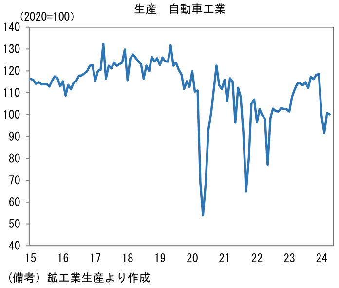 5月初旬に実施された生産予測調査に基づけば、製造工業の生産計画は5月が前月比+6.9%、6月が▲5.6%であった。経産省経済解析室が、生産予測指数の上振れバイアスを補正した5月の予測値は同+2.3%とまずまずの強さであった。6月の生産計画が弱い点は気がかりだが、経産省によれば「生産用機械が、半導体・フラットパネルディスプレイ製造装置が納期調整により生産低下を見込む」という。減産の主因が、根強い需要が見込まれる半導体製造装置の納期調整であるならば、それほど悲観する必要もないだろう。注目の輸送機械工業の生産計画は5月に同+14.5%、6月に同▲4.8%と均してみれば増産が見込まれている。自動車は、本格的な工場再開に加え、過去数年の世界的供給制約(半導体不足)によって積み上がった潜在需要を背景に息の長い増産が期待できる。自動車ローン金利の高止まりによって販売が頭打ちになっている北米市場では、年内に予想されるFedの利下げが追い風となろう。