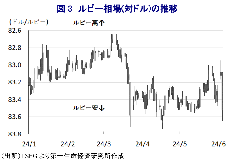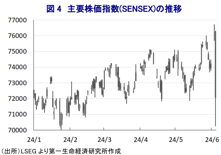 - インドでは4日に議会下院総選挙の一斉開票が行われた。事前の世論調査では与党BJPの勝利が見込まれたが、BJPの獲得議席数は240と大幅に減少して単独過半数を下回るも、与党連合全体では半数を維持した。モディ首相は勝利宣言を行い政権3期目へ意欲をみせるが、求心力の低下は避けられず、内向き姿勢を強めるとみられる。今回の総選挙では与党の大票田であった農村部で議席を失うなど、来月公表する今年度本予算案ではバラ撒き姿勢が強まると予想される。金融市場では政権3期目は構造改革を期待する向きがみられたが、見通しは立ちにくくなっている。中長期的に人口増が期待されるなど経済成長へのストーリーは描きやすいが、その行方はモディ政権の舵取りに掛かっている。他方、内向き姿勢が強まるなかで外交政策の重心がずれることで国際場裏での同国の在り様が変化する可能性もある。金融市場は些か同国に対する過大な期待を抱いていた可能性があり、「身の丈」への修正が求められると言えよう。