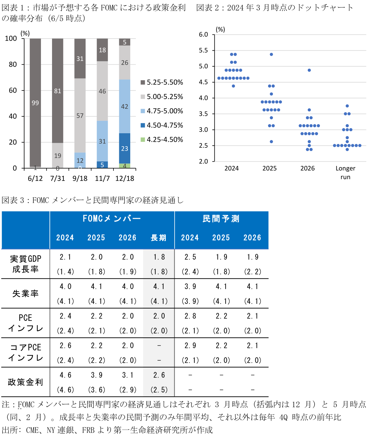 - 同時に公表される6月ドットチャートでは2024~25年の利下げ回数見通しが注目される。金融市場は減速感を強める経済指標を背景に9月の利下げ開始を予想しており、仮にドットチャートが年内2回の利下げ見通しを示す場合、市場はこうした見方への確信を強めると考えられる。