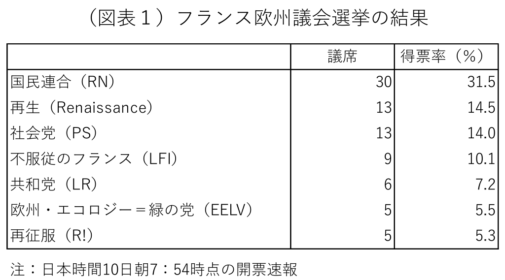 6月6~9日に欧州連合(EU)加盟国で欧州議会選挙が行われ、各国の投票速報が次々と発表されている。フランスでは、ルペン氏の極右政党・国民連合(RN)が31.5%で最多票を獲得し、フランス選出欧州議会議員の最大勢力となる。二番手につけたマクロン大統領のリベラル会派・再生(ルネッサンス)の得票率は14.5%にとどまり、極右政党に大差を付けられた。かつての二大会派の一角・中道左派の社会党(PS)が14.0%で猛追、メランション氏の強硬左派・フランスの不服従(LFI)が10.1%、マクロン支持で揺れるかつての二大会派の一角・中道右派の共和党(LR)が7.2%、環境政党・欧州・エコロジー=緑の党(EELV)が5.5%、ゼムール氏が結党した極右政党・再征服(R!)が5.2%で、議席獲得に必要な5%のラインをクリアしそうだ(図表1)。