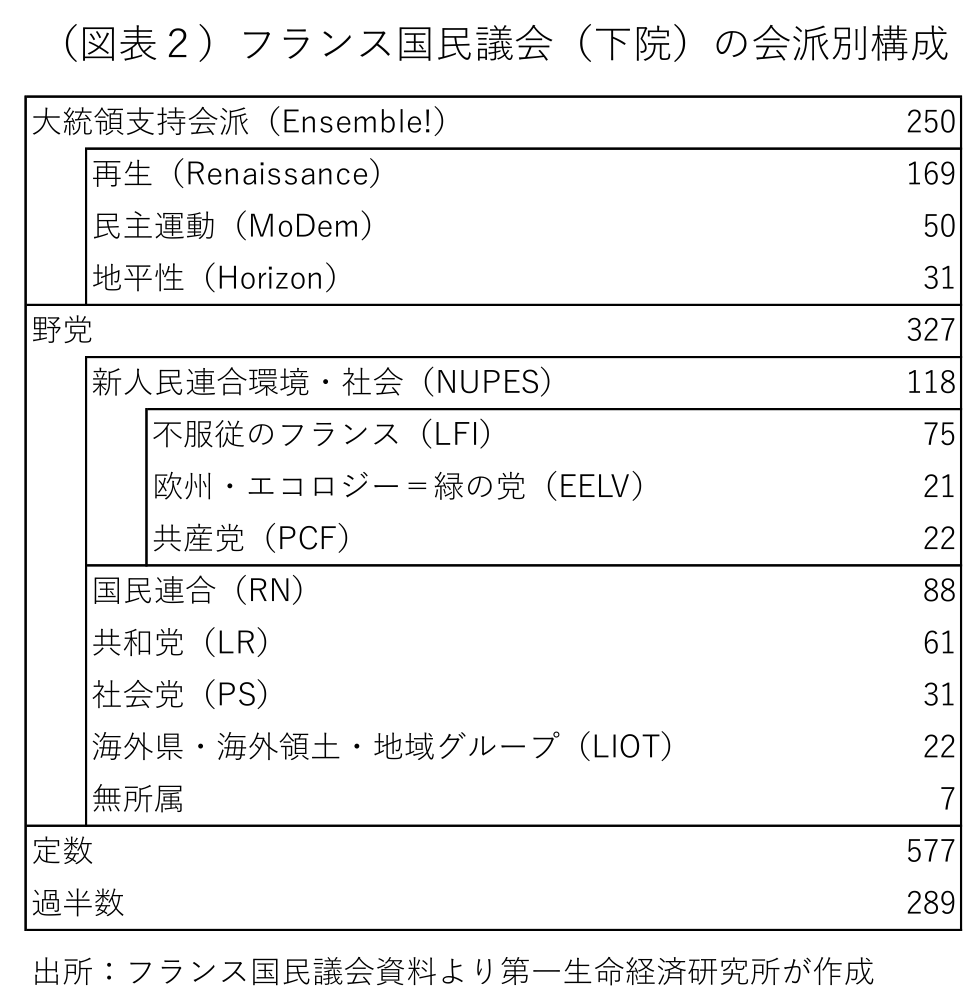 投票結果を受け、マクロン大統領は9日に国民議会(下院)を解散し、6月30日に初回投票、7月7日に決選投票を行うことを表明した。フランスでは2022年の国民議会選挙で大統領支持会派が議会の過半数を失い、議会採決を迂回する特別な立法手続き(憲法49条3項)を乱発する厳しい議会運営を強いられてきた(図表2)。政権の支持率低迷で厳しい財政緊縮が困難ななか、5月31日には大手格付け会社がフランスの国債格付けを従来の「AA」から「AA-」に引き下げた。秋の来年度予算審議に向けて、議会運営の紛糾は避けられず、野党勢は1月に就任したアッタル首相が率いる内閣への不信任案を相次いで提出し、議会の解散・総選挙を求めていた。筆者は6月3日のレポート「フランス国債格下げ、マクロン大統領に痛手」で、欧州議会選挙での敗北後、野党の内閣不信任決議が通り、年内に解散・総選挙が行われる可能性があると指摘したが、マクロン大統領は選挙後のテレビ演説で「欧州議会選挙の結果を無視することはできず、国民に選択の機会を提供する」と述べ、自ら議会の解散を決断した。マクロン大統領は就任以来、国際社会やEU運営で強いリーダーシップを発揮する一方、国内では時に強硬手段を使って改革を断行し、傲慢で国民の声に耳を傾けないとの批判に晒されてきた。選挙結果を無視すれば、与党の更なる地盤沈下が避けられないとの判断だろう。