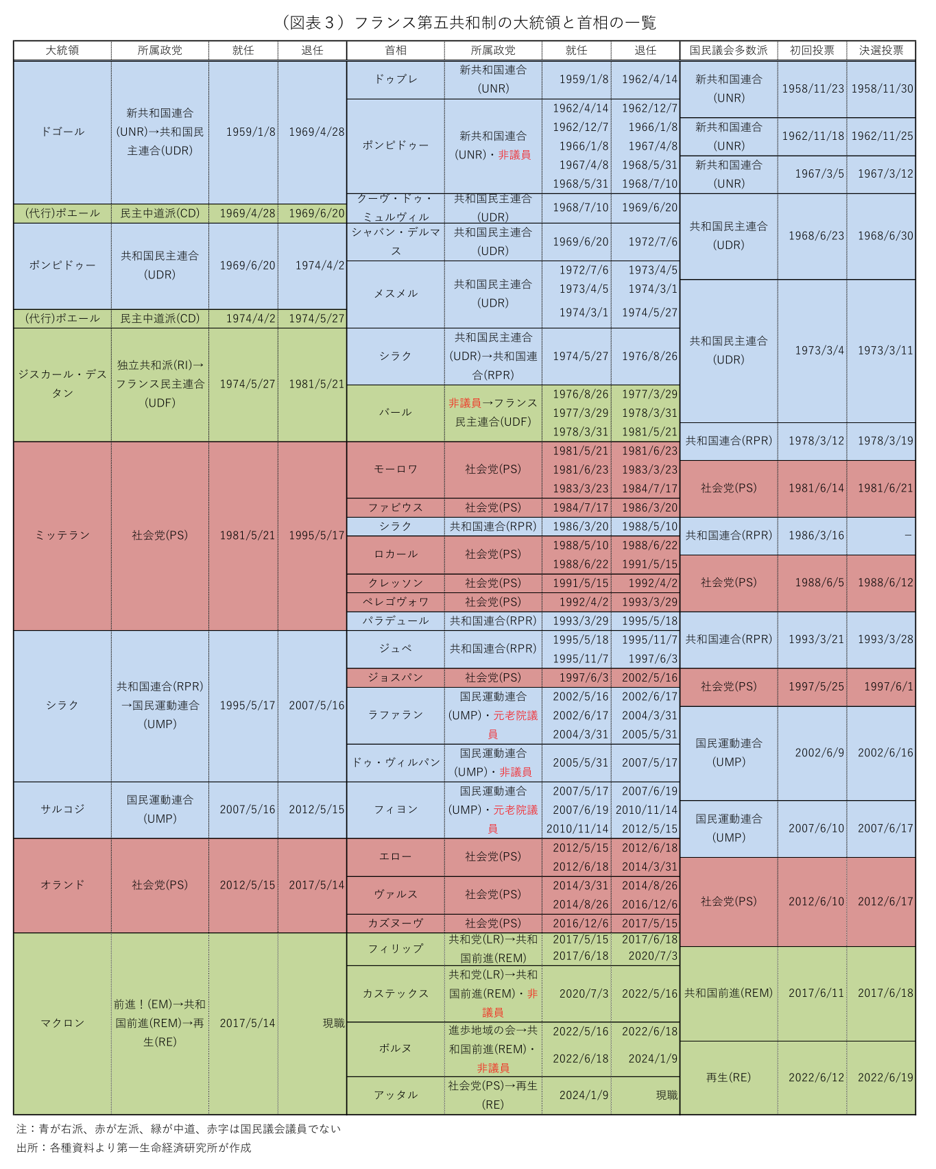 第五共和制下のフランスでは、大統領の出身政党と議会の多数派が食い違うこと(コアビタシオン)が何度か発生し、政権運営を難しくしてきた(図表3)。こうした事態を回避するため、2000年の国民投票で大統領任期を従来の7年から5年に短縮し、大統領選挙の直後に国民議会選挙を行うように改められた。その後は大統領の与党が直後の議会選挙で敗北したことはなく、コアビタシオンが発生していない。だが、欧州議会選挙での大敗直後に行われる今回の国民議会選挙では、大統領支持会派の苦戦が避けられない。このままの勢いで国民連合が国民議会の第一党となれば、マクロン大統領は極右政党から首相を選ばざるを得なくなる恐れがある。マクロン大統領としては、極右首相誕生への国民の危機感、選挙制度が与党に有利に働く可能性、選挙戦の顔交代、野党勢力の分断などに一縷の望みを託しているのだろう。