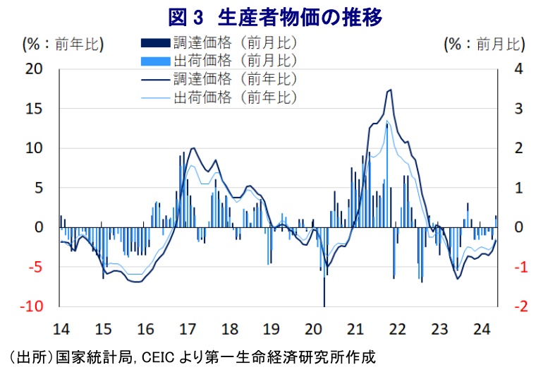 ディスインフレ圧力の根強さの背景には、川上の段階に当たる生産者物価に下押し圧力が掛かる展開が続いていることが影響しているものの、5月の生産者物価(調達価格)は前年度月比▲1.7%と16ヶ月連続で前年を下回る伸びで推移しているものの、前月(同▲3.0%)からマイナス幅が縮小するとともに、前月比も+0.3%と前月(同▲0.3%)から7ヶ月ぶりの上昇に転じるなど、ディスインフレ圧力の後退に繋がる兆しが出ている。年明け以降の国際金融市場では中国景気が底入れの動きを強めていることを受けて非鉄金属を中心に国際商品市況が上昇してきたため、こうした動きを反映して非鉄金属関連や石炭など燃料関連などで物価上昇圧力が強まっていることが影響している。このように川上の段階で物価上昇圧力が強まる動きを反映して、生産者物価(出荷価格)も前年同月比▲1.4%と20ヶ月連続で前年を下回る伸びで推移するも前月(同▲2.5%)からマイナス幅は縮小しているほか、前月比も+0.2%と前月(同▲0.2%)から7ヶ月ぶりの上昇に転じるなど、川中や川下の段階に向けて物価上昇圧力が伝播している様子がうかがえる。調達価格の上昇の動きを反映して原材料や中間財など生産手段に関連する分野で幅広く物価上昇圧力が高まる動きがみられる一方、消費財関連の出荷価格には幅広く下押し圧力が掛かるなど、原材料価格の上昇を製品価格に転嫁することができない展開が続いている。なかでも耐久消費財(前月比▲0.3%)は下振れする展開が続いているほか、一般消費財(同±0.0%)も横這いで推移しており、家計部門の財布の紐が依然として固いことに加え、EC(電子商取引)の普及が進むなかで大手サイト間の価格競争が激化していることも価格転嫁を困難にする一因になっているとみられる。足下の雇用環境を巡っては民間部門を中心に底打ちの兆しが出ているものの、公的部門を中心に調整圧力がくすぶるとともに、今年は大卒者が専門学校卒者を併せて1179万人と過去最高を更新する見通しの上、大卒者の内定率が5割を下回るなど過去最低となっている模様であり、家計消費を取り巻く環境が好転する見通しは低い。その意味では、中国経済のデフレ懸念の払しょくには不動産問題の解決が切っても切り離せない状況にあるものの、その道のりは決して容易ではないことは間違いなく、足かせとなる展開が続く可能性は高い。