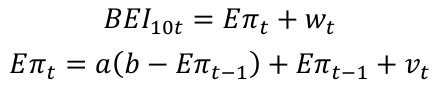 上述の通り、BEIをそのまま期待インフレ率と捉えるには、リスクプレミアムの存在等により注意が必要になる。そこで、BEIの動向から真の期待インフレ率を推計する手法として、状態空間モデルを用いた推計手法の開発が近年盛んに行われている。状態空間モデルでは、期待インフレ率を未知の確率変数(状態変数)として扱い、カルマンフィルターによって推計する。例えば、マクロ経済学で標準的なバシチェック・モデルの考え方を応用して、期待インフレ率が長期的な平均水準bに対する回帰性aを持つモデルと考えると、期待インフレ率Eπは以下のように表すことができる。(ただし、ν,wは誤差項)