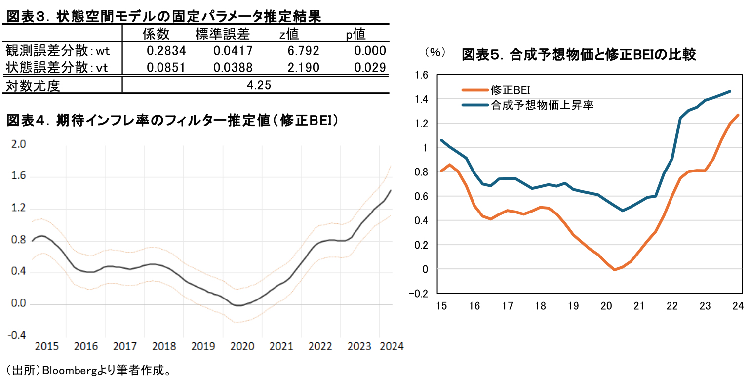 図表4は、上記モデルを用いて、筆者が実際にカルマンフィルターによって推計した期待インフレ率を示している(便宜的に、これを修正BEIと名付けた)。