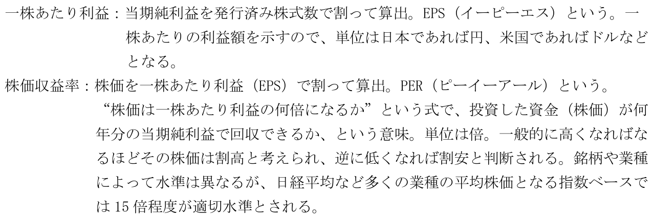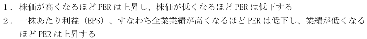 - EPSは企業の業績によって左右される。これに対し、PERは株価がEPSの何倍かを示したもので、株価が割高な水準にあるかどうかを図る指針となる。