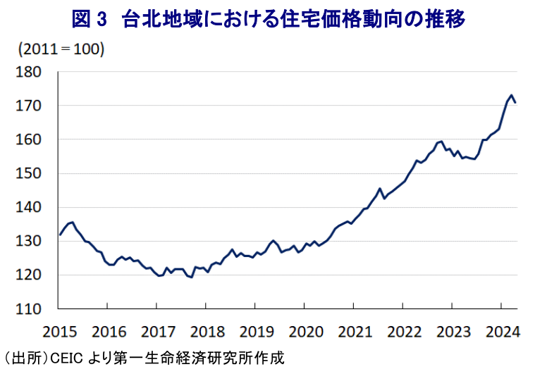 台湾中央銀行は13日に開催した定例の金融政策委員会において政策金利を2会合ぶりに2.000%に据え置く決定を行った。ここ数年の台湾では、商品高と国際金融市場における米ドル高を反映した通貨台湾ドル安による輸入インフレ、コロナ禍一巡による経済活動の正常化の動きも重なりインフレが上振れしてきた。中銀は一昨年3月に10年半ぶりの利上げに動いたほか、その後も物価と為替の安定を目的に断続利上げを迫られる一方、一昨年半ばにはインフレが一時14年ぶりの高水準となるもその後は頭打ちに転じるなど落ち着きを取り戻す動きがみられた。しかし、昨年後半以降は異常気象による農作物の生育不良をきっかけに多くのアジア諸国が食料インフレに直面するとともに、中東情勢を巡る不透明感の高まりを受けた国際原油価格の底入れも重なり、台湾も食料品やエネルギーなど生活必需品で物価上昇圧力が強まる事態に直面した。さらに、今年1月に行われた総統選では与党・民進党の頼清徳氏が勝利する一方、同時に実施された立法委員(立法院議員)総選挙では最大野党・国民党が議席を増やすとともに、第3極を目指す民衆党と多数派を形成した結果、立法院長に国民党の韓国瑜氏が就任するなど議会と政府は『ねじれ状態』となった。こうした政策運営を巡る不透明感に加え、中国本土との緊張状態が意識されたことで通貨台湾ドル安圧力が強まるなど輸入インフレが再び懸念される事態となったため中銀は3月の定例会合において再利上げに動いた(注1)。その後のインフレは一進一退の動きをみせるとともに、台湾ドル相場は一段と調整の動きを強めるなど輸入インフレが警戒される事態に直面してきた。足下の台湾ドル相場は調整の動きが一服する動きをみせているものの、3月会合時点に比べて台湾ドル安水準で推移しているにも拘らず、今回の定例会合では前回会合での利上げ実施の効果を見定めるべく様子見姿勢に転じている。会合後に公表した声明文では、同国経済について「人工知能(AI)など新興技術に関連する需要の旺盛さを反映して輸出が押し上げられる」とともに「内需も総じて堅調な動きをみせている」として、「今年の経済成長率見通しは+3.77%になる」と3月時点(+3.22%)から上方修正している。また、物価動向について「食料品や家賃、サービス関連で物価上昇圧力がくすぶる」ものの、「年後半にはサービス物価の鈍化が進む」として「今年通年のインフレ率見通しは+2.12%になる」と3月時点(+2.16%)から下方修正している。一方、昨年後半以降に住宅取引が活発化していることを受けて、特定地域を対象に住宅ローンに対するLTV(総資産有利子負債比率)規制の上限を本日(6月14日)付で70%から60%に引き下げる規制強化に動くとともに、来月1日付で預金準備率を25bp引き上げるなど引き締め姿勢を強めている。会合後に記者会見に臨んだ同行の楊金龍総裁は今回の決定について「金融市場の安定と経済成長に資するもの」とした上で、預金準備率の引き上げについて「銀行の貸出態度が慎重になり、不動産市場への資金流入が抑制される」との見方を示している。その上で、足下のスタンスについて「政策のトーンはさらなる引き締めである」としつつ、先行きの政策運営について「政策変更は段階的で小刻みになる」、「金融引き締めはインフレ期待の抑制に繋がる」との考えを示している。こうした状況を勘案すれば、先行きの政策運営を巡っては利上げなど全面的な金融引き締めに動く可能性は低いと見込まれる一方、住宅価格の動向に応じて預金準備率の引き上げなど小刻みなスタンス変更を行う余地は残されていると判断できる。