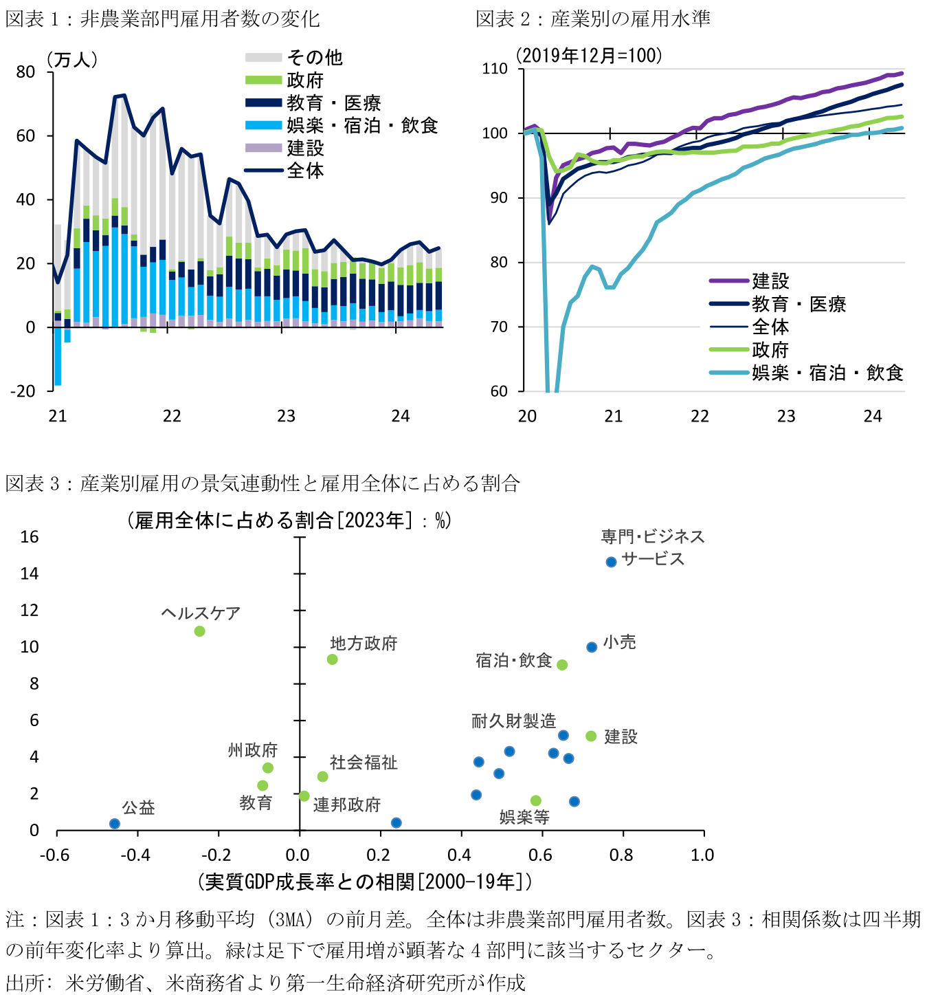 図表1は2021年以降の非農業部門雇用者数の前月差(3か月移動平均)、及びそれに対する主要産業の寄与度を示したものである。2021~22年においては製造業や小売・卸売業を含む「その他」が一定の寄与度を有しており、新型コロナウィルス収束による経済回復に伴い幅広い産業で雇用が増加(正常化)したことが見て取れる。一方、2023年以降の雇用回復は「建設」「娯楽・宿泊・飲食」「教育・医療」「政府」の4部門に集中している。実際、2024年1~5月の雇用者数が124万人増加したうち、これら4部門の増加幅は+93万人に達するなど、全体の雇用者数の伸びの75.1%を占めている。