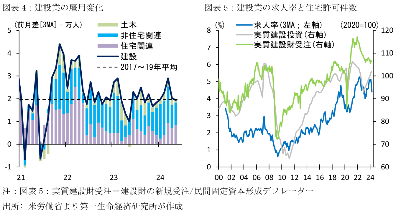 実質建設投資(住宅投資と構造物投資の合計)は高金利政策を主因に2022~23年にかけて落ち込んだものの、足下では住宅投資の底入れや半導体工場等の新規建設を背景に持ち直しの動きを示している。実質建設投資に先行する傾向がある建設財の新規受注は横ばい圏の推移となっており、2024年内にFRBが利下げに踏み切る見通しを勘案すると、建設投資が大幅な調整を強いられる可能性は低い。