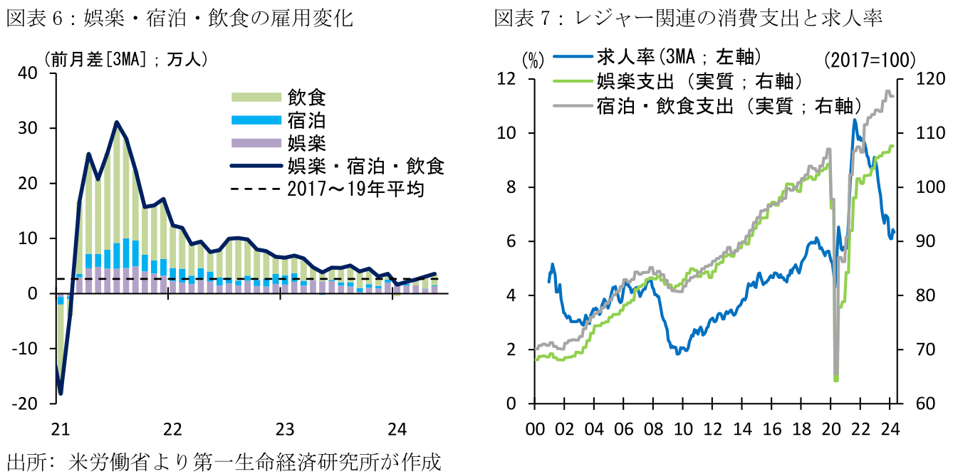 娯楽・宿泊・飲食は雇用者数全体の10.6%を占める。同産業の雇用者数は新型コロナウィルスの感染拡大が始まった2020年4月に半減したものの、その後は経済活動の正常化に伴い急回復を示した(図表6)。建設業同様、2024年以降の娯楽・宿泊・飲食における雇用拡大ペースはコロナ以前に戻っており、レジャー産業の雇用正常化に一服感が示されている。とはいえ、求人率は依然高水準を保つなど、雇用の余剰感よりも人手不足感の方が強い。