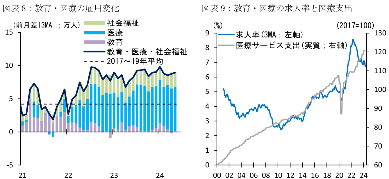 教育・医療は雇用者全体の16.2%を占めており、これには大学等の民間教育機関(公教育は後述する政府部門に該当)、医療ケア施設や介護老人ホーム、保育園等が含まれる。2024年1~5月における全雇用増加の36.2%を同産業が占めるなど、足下の雇用拡大の最大のけん引役になっている。特に増加が堅調なのは外来診察を担うクリニックや(大型)病院を中心とした医療セクターであり、2024年5月時点の医療業の雇用者数はコロナ前(2019年12月)と比べて7.3%(+120万人)増加している(図表8)。教育・医療の雇用は大幅な増加を示しているものの、求人率はコロナ以前を大幅に上回るなど、深刻な人手不足感の解消には程遠い状況だ。