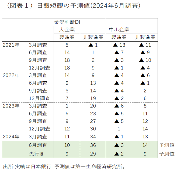 7月1日に発表される日銀短観6月調査は、大企業・製造業の業況判断DIが▲1ポイント悪化する見通しである(3月調査11→6月予測10、図表1、2)。非製造業の方は、+2ポイント改善する見通しである(3月調査34→6月予測36)。