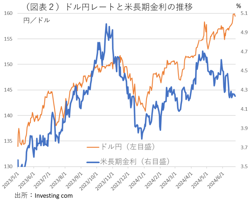 ドル円レートは、1ドル160円の警戒ラインに接近している(図表1)。4月29日・5月2日の為替介入では、このラインが強く意識された経緯がある。この介入警戒感は、結果的に約2か月間しか持続性がなく、再び円安リスクを強く意識させている。