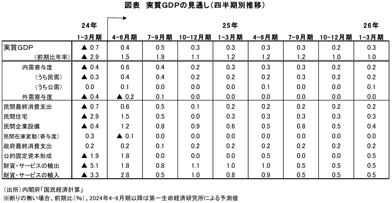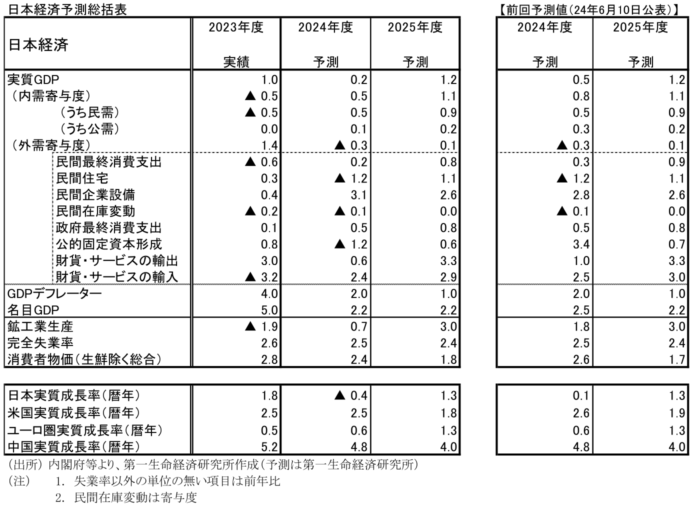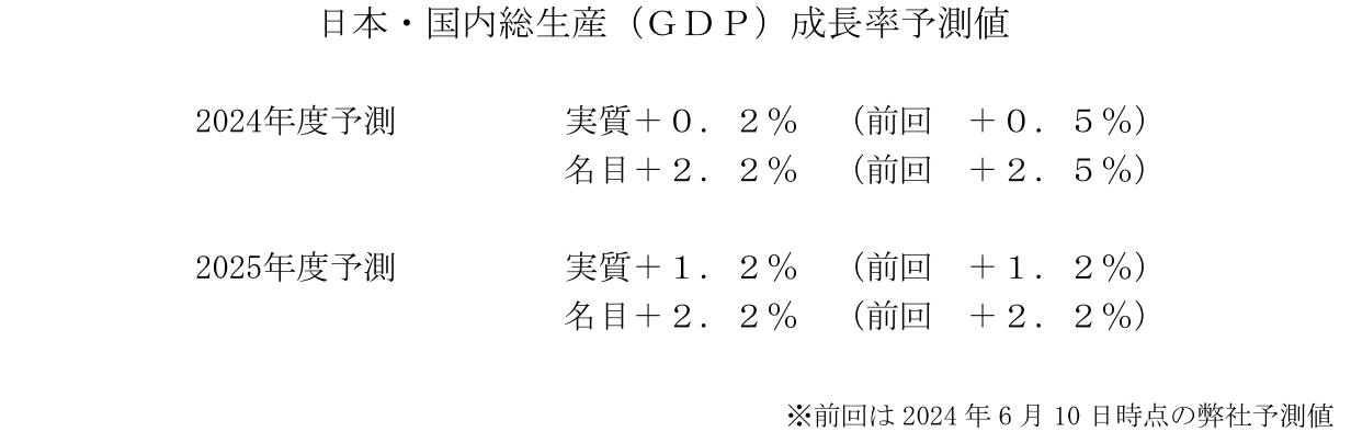 実質GDP成長率の見通しは、24年度が+0.2%(24年6月時点予測:+0.5%)、25年度が+1.2%(同+1.2%)である。24年1-3月期の実質GDP成長率は前期比年率▲2.9%と、改定前の同▲1.8%から大きく下方修正された。これにより成長率のゲタが低下したことを主因として、24年度の成長率見通しを下方修正した。