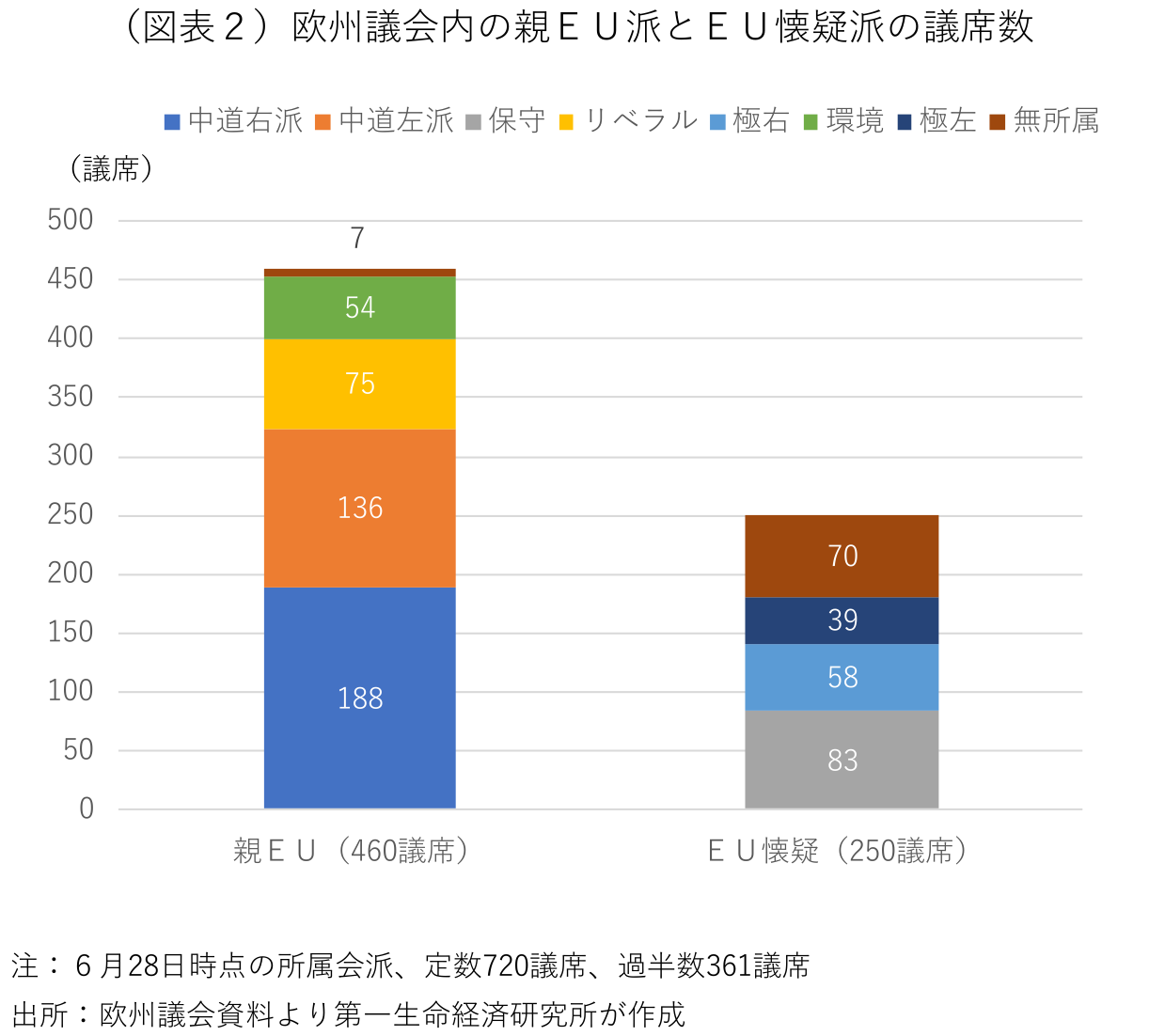 親EU派が過半数を確保した欧州議会で、EUに懐疑的な右派政党間の合従連携の動きがある(図表1・2)。ハンガリーのオルバン首相は、自身が率いる右派ナショナリスト政党「フィデス」と、チェコの前政権与党「不満のある市民の行動(ANO)」、9月の総選挙で政権奪取の可能性があるオーストリアの極右政党「自由党(FPO)」とともに、新たな右派会派を結成する。