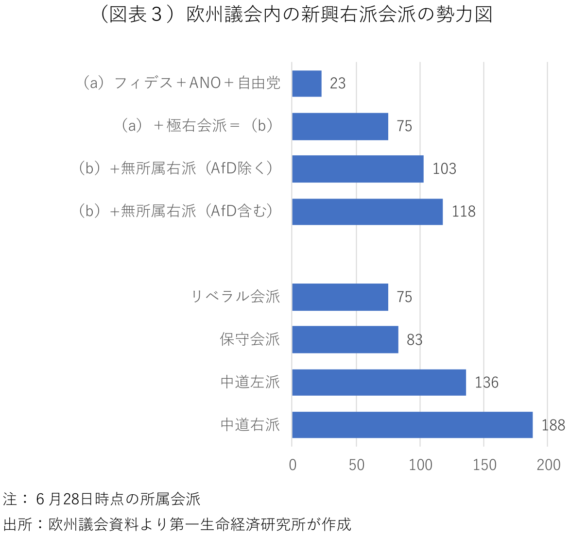 フィデス、ANO、FPOの新会派結成の動きに、現在IDに所属する右派政党の全てが合流した場合、イタリアのメローニ首相が率いる保守会派「欧州保守改革(ECR)」や、親EUのリベラル会派「欧州刷新(リニュー・ヨーロッパ)」と匹敵する勢力となる(図表3)。さらに無所属右派のうち、ナチスを巡る不適切発言でIDを追放されたドイツの右派政党「ドイツのための選択肢(AfD)」を除いた全政党が合流した場合、中道右派「欧州人民党(EPP)」、中道左派「社会民主進歩同盟(S&D)」に次ぐ第三勢力の地位を固める。穏健化による支持拡大を目指す右派勢力はAfDと距離を置いており、AfDが新会派に合流する可能性は今のところ低い。AfDも合流すると中道左派と第二会派の座を争うことになる。