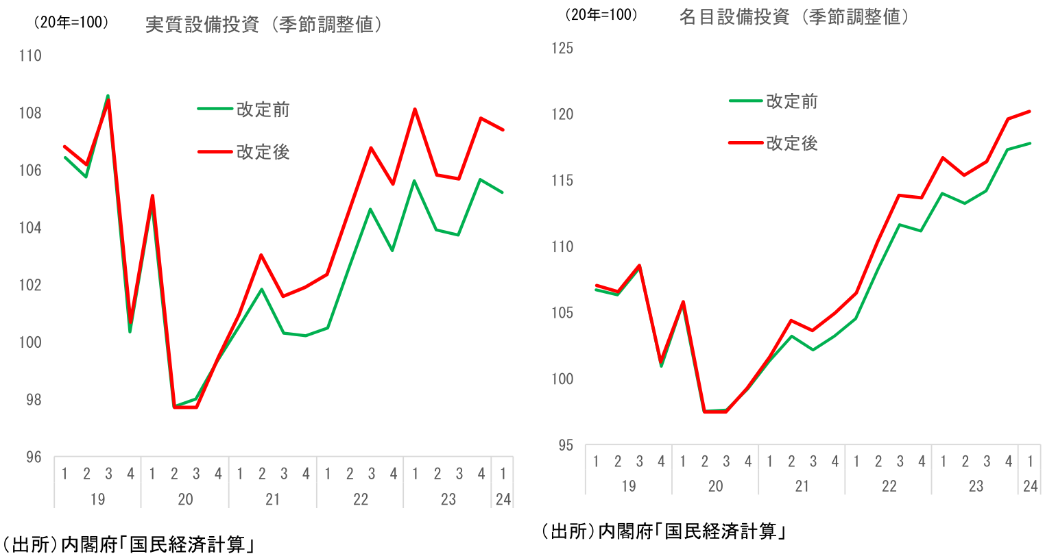 これまで、企業の設備投資計画等のアンケート調査の結果と比べて、GDP設備投資の伸びが控えめなものにとどまっていたことが謎とされていた。この両者の乖離の理由は、①設備投資計画は名目値であるため、資材価格等の高騰により押し上げられている、と説明されることが多かったが、今回の改定により、②GDPの設備投資がこれまで過小評価されていた、という理由も新たに加わった。