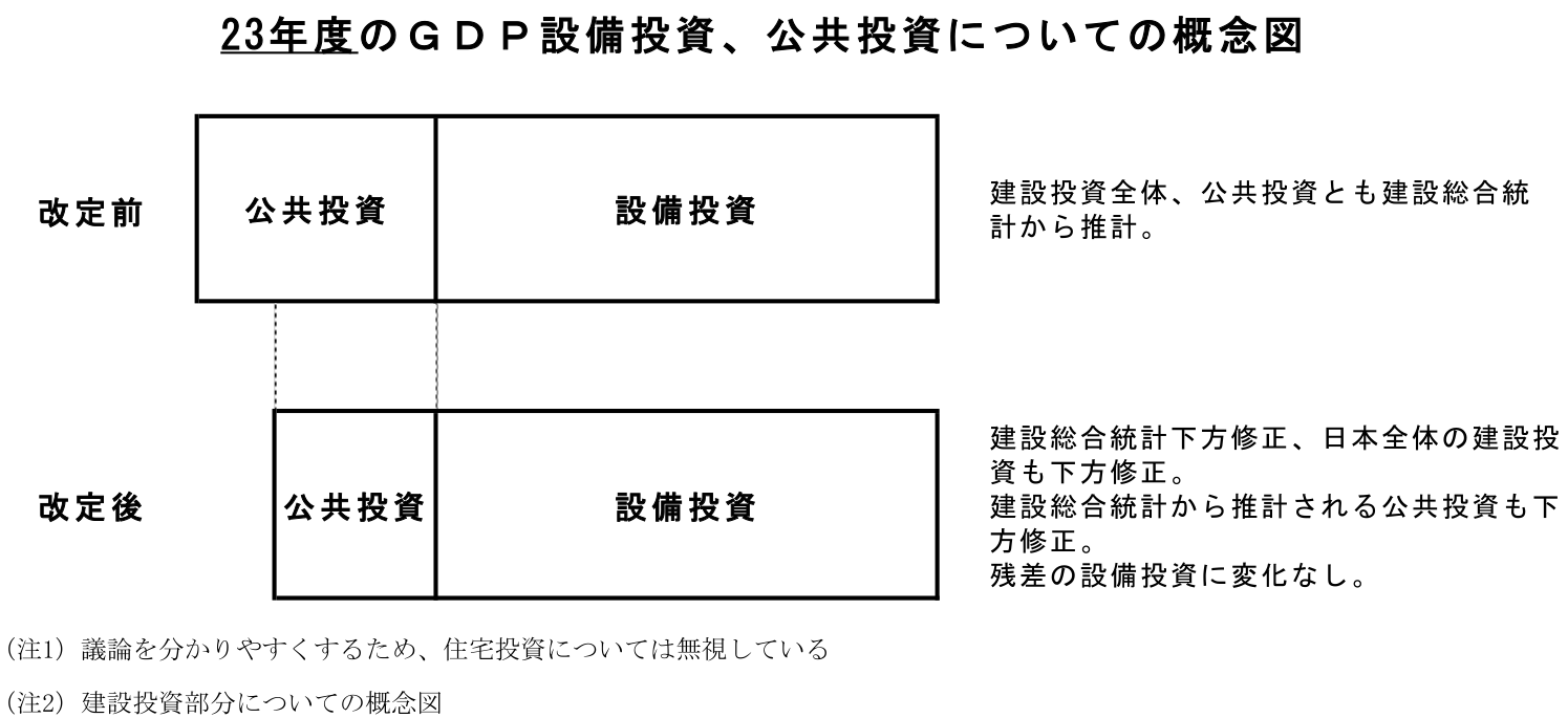 建設工事受注動態統計の大規模訂正により23年度の建設総合統計が下方修正された。これにより、GDPの日本全体の建設投資の伸びが下方修正された。