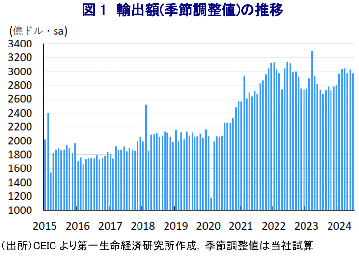 このところの中国経済を巡っては、若年層を中心とする雇用回復の遅れに加え、不動産市況の低迷が幅広い経済活動の足かせとなるなかで家計消費をはじめとする内需は力強さを欠く展開が続く一方、外需を頼みにした景気下支えの動きが続いている。世界経済を巡っては、コロナ禍やウクライナ戦争を機に分断の動きが広がるとともに、デリスキング(リスク低減)を目的とするサプライチェーン見直しの動きが広がるなど、世界貿易の在り様に影響を与える動きがみられる。こうした状況の一方、ここ数年の中国においては習近平政権が目指す「製造強国」に向けた財政支援を追い風に色々な分野で生産力を拡大させる動きをみせているほか、「新質生産力(新たな質の生産力)」を目指す動きも生産拡大の動きを後押ししている。しかし、上述したように家計消費をはじめとする内需は力強さを欠くなかで当局は需要喚起に向けた買い替え促進のほか、規制緩和など支援を拡充させる動きをみせているものの、実態としては過当競争が促される難しい状況に陥っている。こうしたなか、需要を外需に依存せざるを得ない状況に陥るとともに、そうした動きを巡っては欧米などが警戒感を強める動きをみせている。米国では11月の大統領選を前に対中姿勢を強める動きがみられるなか、通商法301条に基づく対中追加関税について米国経済や安全保障上の観点で重視する戦略分野を対象に対象品目の拡大や関税率の引き上げに動いている。具体的には鉄鋼やアルミニウム、半導体、EV(電気自動車)、バッテリー・バッテリー部品、需要鉱物(天然黒鉛・永久磁石など)、太陽電池、船舶対陸上クレーン、医療製品を対象に関税率を大幅に引き上げており、なかでもEVについては25%から100%に大幅に引き上げられている。なお、現時点において中国から米国に輸出されているEVは極めて少ないことを勘案すれば、今回の関税引き上げに伴う具体的な影響は軽微なものに留まると見込まれる。一方、米国の動きに追随する形でEU(欧州連合)も中国製EVに対する警戒を強めるなか、今月初めに暫定的な制裁関税措置としてメーカー別に17.4~37.6%の追加関税を課すことを決定しており、EU向けのEV輸出を拡大させてきたなかで少なからず悪影響が出ることが懸念される。他方、ウクライナ戦争を機に欧米などがロシアへの経済制裁を強化するなか、ロシア国内での物資不足が懸念されたにも拘らず中国からロシアへの輸出が拡大したことでロシア経済を下支えするとともに、ロシア産原油の輸入拡大によりロシアの継戦能力の維持に繋がっていると捉えられる。また、世界経済の分断が懸念されるなかで中国はいわゆる「グローバルサウス」と称される新興国にウイングを広げることにより、新興国向け輸出の拡大を通じて欧米との関係悪化の影響の軽減を図ろうとしている様子もうかがえる。上述のように足下の中国景気は外需の動向がカギを握る度合いが強まる一方、欧米などが「中国包囲網」の動きを強めるなかで景気下支えの観点では外需喚起に向けた動きがこれまで以上に重要になっていると捉えられる。