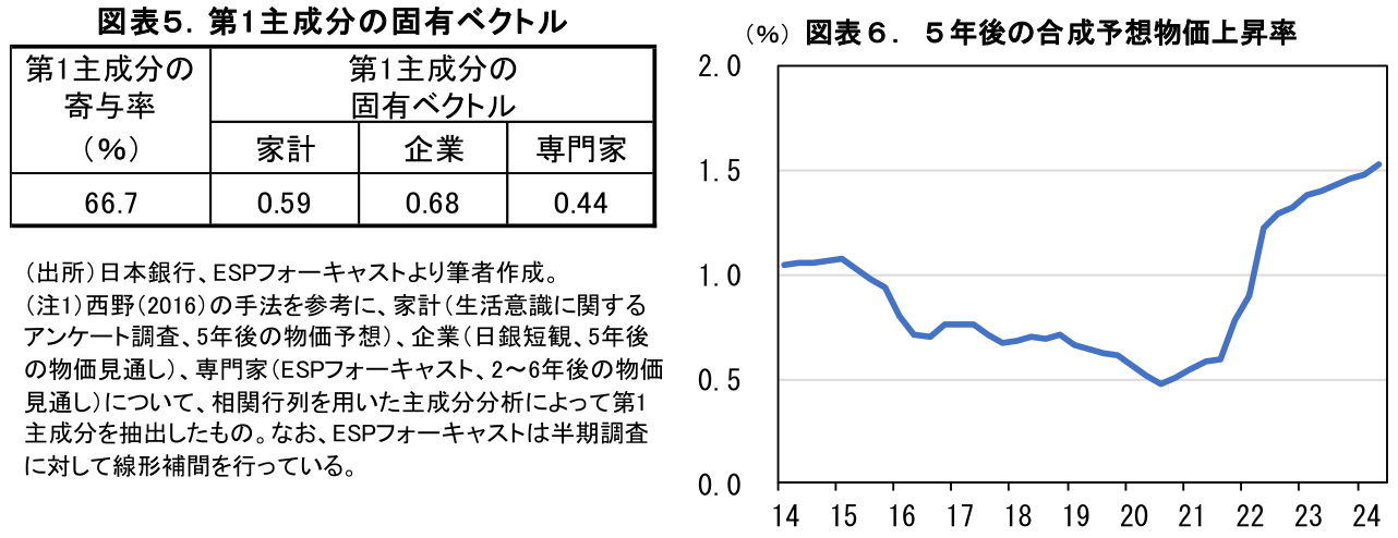 上記のような各種アンケート調査は、各経済主体で水準感に差異があることや、調査特有のバイアスがあることで知られている。こうした課題を解決し、インフレ予想の基調的な動向を読み解くために、主成分分析を用いた「合成予想物価上昇率」を試算した(詳細は「インフレ予想の統計的推定の展開①~合成予想物価上昇率の有用性~」を参照)。