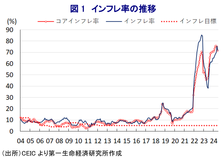 トルコ中銀は、23日に開催した定例の金融政策委員会において政策金利である1週間物レポ金利を4会合連続で50%に据え置く決定を行った。昨年以降の同国は、大統領選後の内閣改造を経て誕生した経済チーム(財務相と中銀総裁)の下で正統的な政策運営に舵を切る動きをみせてきた。具体的には、中銀は物価と為替の安定を目的に累計4150bpもの利上げを実施。政府もリラ安阻止を目的に導入した保護預金制度の解除や包括的な財政緊縮策に舵を切った。こうした正統的な政策運営への転換を受けて、主要格付機関は相次いで同国の外貨建長期信用格付を引き上げるなど、国際金融市場においても機関投資家を中心に同国に対する評価が向上している。さらに、先月には憲法裁判所が2018年にエルドアン政権が公布した大統領令(中銀総裁と副総裁の任命と解任権を大統領に付与するもの)に対して無効とする判断を下しており、エルドアン大統領が人事権を盾に中銀に対して圧力を掛けることが難しくなっている。そして、今月初めに公表された6月のインフレ率は前年比+71.6%と高水準ながら頭打ちに転じる動きが確認されており(注1)、インフレを巡る状況はいよいよ『最悪期』を過ぎつつあると捉えられる。このところの国際金融市場においては、米国のインフレ鈍化を受けて米FRB(連邦準備制度理事会)による利下げ実施が意識されるなかで米ドル高の動きに一服感が出ており、多くの新興国通貨で調整圧力が後退する動きがみられるものの、リラ相場については一段と調整する事態は免れるも底這いで推移する展開をみせている。これは、上述のようにインフレは頭打ちに転じるなど最悪期を過ぎつつあるものの、実質金利は▲20%を上回る大幅マイナスで推移するなど投資妙味の乏しさが影響しているとみられる。よって、インフレの頭打ちが確認された後も経済チームの面々はSNSなどを通じて現行の引き締め姿勢を継続する考えを示していたなか、今回の中銀の決定はそうした見方を反映したものと捉えられる。会合後に公表した声明文では、今回の決定について前回会合同様に「利上げの効果発現に時間を要する点を考慮して現状維持を決定した」との見方を示している。その上で、物価動向について「6月は顕著な低下トレンドが確認されたが、7月は統制価格や税、食料品を中心とする物価上昇を受けて一時的な上振れが懸念される一方、基調的な動きは限定的なものに留まる」との見方を示した上で、「インフレ期待と価格決定行動が見通しと一致するか否かを注視している」との考えをみせている。また、先行きの政策運営について「利上げの効果発現の遅れを考慮しつつ、インフレの基調的な低下を確実にして中期的目標実現のために必要な金融、財政環境を醸成すべく政策決定を行う」とした上で、「インフレリスクに細心の注意を払いつつ、利用可能なあらゆる手段を断固として活用する」との考えをあらためて強調している。今月19日には主要格付機関のムーディーズ社が同国の外貨建信用格付を2ノッチ引き上げており(B3→B1)、主要格付機関3社がいずれも格上げを実施するなど間違いなく国際金融市場における評価は向上していると捉えられる。あとは一時的な上振れが懸念されるインフレが着実に鈍化の動きを強めるとともに、大幅マイナスが続く実質金利がプラスに転じるまで忍耐強く現行の引き締め姿勢を維持できるかに掛かっており、リラ相場についてもそうした明確な『サイン』を見極める展開が続くと予想される。
