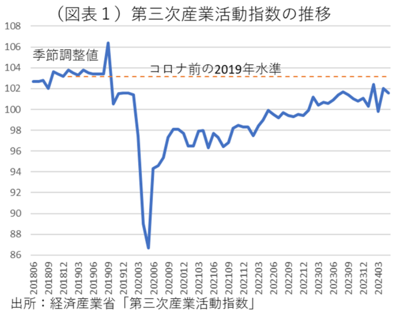 まず、活動指数全体はまだ2019年平均(103.1)を2024年5月時点(季節調整値101.6)では回復していない(図表1)。経済再開は2023年5月以降に進んだが、物価上昇が個人消費の重石になって、回復ペースを鈍いものにしている。この第三次産業活動指数は、サービス産業の売上データ等をそれに対応する物価指数でデフレートした実質値である。だから、物価が高騰した分、活動指数が停滞する効果が表れる。その内訳はBtoCだけではなく、BtoBのサービス業種も含んでいるが、総体ではおおむね低調な個人消費統計と同じ動きになっている。ここには、内需型ビジネスが人口減少圧力によって、徐々に勢いを失っている事情もあると考えられる。時間が経てば元に戻るのではなく、人口が減る分だけ、元に戻ろうとしても水準割れしてしまうということだろう。