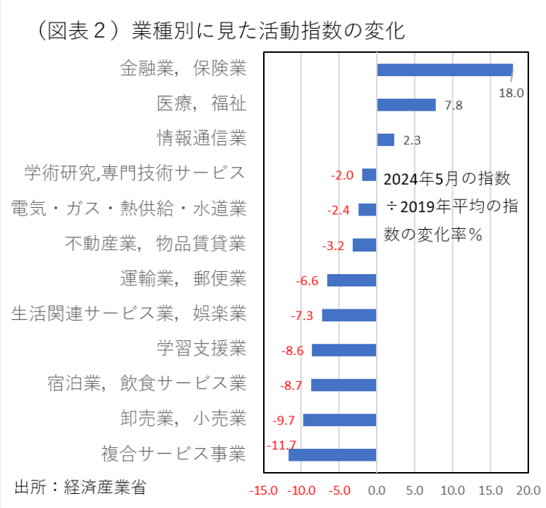 次に業種ごとの変化に注目してみたい。2019年平均に比べて、2024年5月はどんな業種が大きく伸びているのか(図表2)。