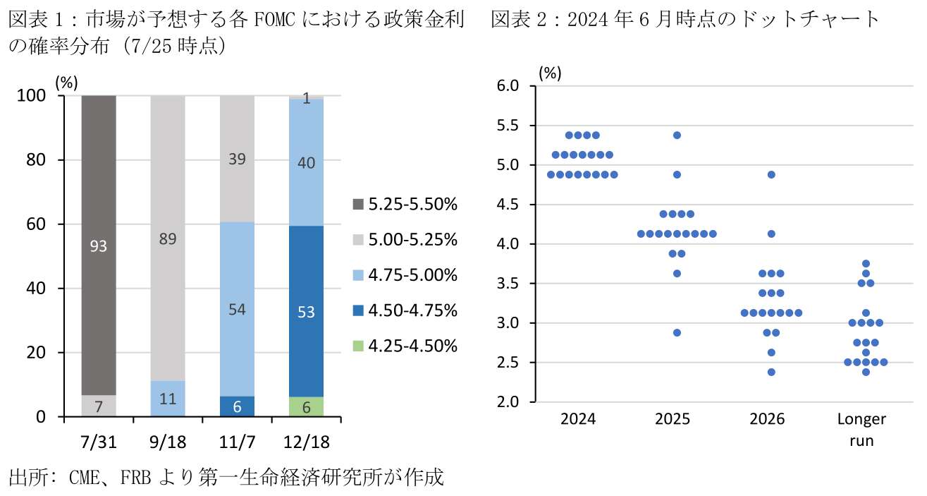 7月FOMC(7/30~31開催)では8会合連続で政策金利の現状維持が決定される見通しだ。7/25時点のCMEのFedWatch(FF金利先物)に基づくと、市場による政策金利(現行:5.25~5.50%)の据え置き予想が93.3%に達しており、25bpsの利下げを見込むのは6.7%に留まる(図表1)。インフレ減速が鮮明化する状況においても、FRBは現行の高金利政策を維持しつつ、インフレ鎮静化の進展を注視する姿勢を引き続き示すとみられる。