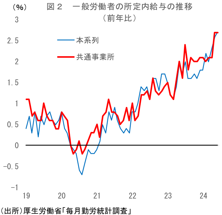 こうした特別給与増加による賃金上振れの一方、春闘賃上げの影響を大きく受ける所定内給与については足踏みとなった。一般労働者の所定内給与(共通事業所ベース)は前年比+2.7%で前月と同じ伸びにとどまった。上昇率としてはかなり高く、決して弱い結果というわけではないのだが、筆者は+3%台乗せもあり得ると予想していただけに、やや期待外れの印象である。