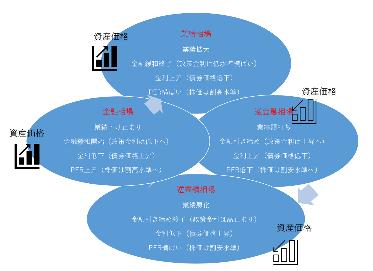 - 典型的な相場分類に従えば、現在の米国市場は逆業績相場を抜け出し、金融相場に片足を突っ込んだ状況にあると考えられる。景気減速の兆候が散見される中、インフレ率は鈍化し、金融緩和(≒金利低下)方向への政策転換が既定路線になっている。株式PERは、直近の株価下落を受けて小幅に低下したが、依然として高く、既に金融相場入りしたかのような数値になっている。