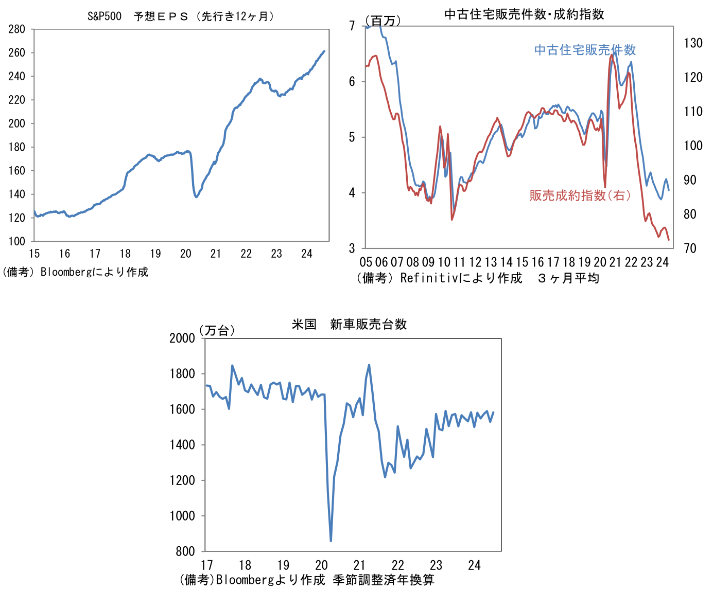 企業業績に目を向けると、S&P500の予想EPSは12ヶ月後に+14.0%、24ヶ月後に+9.6%の成長が見込まれている。指数寄与度の大きい少数の大手企業(半導体、テック)によって全体の強さが誇張されている側面はあるにせよ、マクロ的に良好な雇用・所得環境が維持される下で、個人消費が底堅さを維持していること等から全体として上向いている。先行きもFedの利下げを前提にすれば、金利上昇に脆弱な住宅販売の底入れが期待できる。既に住宅ローン金利は低下に転じていることから、異例の低水準に落ち込んでいる中古住宅販売件数は回復に向かう公算が大きいと判断される。またローン金利低下によって自動車販売台数の増加も予想される。