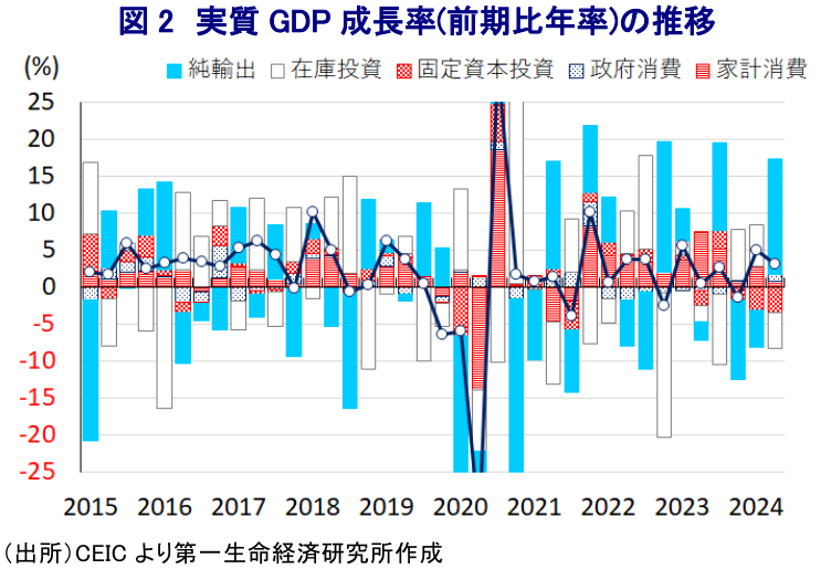 なお、タイ経済はASEAN(東南アジア諸国連合)主要国のなかでコロナ禍からの経済の立ち直りが遅れており、セター前政権は内需喚起を目的に総額5,000億バーツ(GDP比2.7%)規模のデジタルウォレットを通じた現金給付策を行う方針を掲げているものの、実施が当初計画から大きく遅れる展開が続いている。また、ここ数年は商品高やコロナ禍一巡による経済活動の正常化に加え、国際金融市場における米ドル高を受けた通貨バーツ安による輸入インフレも重なりインフレが大きく上振れしたが、商品高の一巡やプラユット元政権が実施した燃料補助金の影響も重なり昨年のインフレは下振れしたため、セター前政権は度々中銀に対して利下げを要求する動きをみせた。しかし、中銀はセター前政権が計画するバラ撒き政策による財政悪化や家計債務の増大リスクに加え、バーツ安や異常気象による食料インフレの動きも影響してインフレ圧力が強まることを警戒して慎重な政策運営を維持するなど、中銀と政府の対立が先鋭化する動きがみられた(注2)。さらに、同国経済はASEAN内でも外需依存度が相対的に高く、財輸出の約15%、外国人観光客の3割を中国(含、香港・マカオ)が占めるなか、足下の中国の景気減速は外需の足を引っ張っている。こうしたなか、4-6月の実質GDP成長率は前年同期比+2.3%と前期(同+1.6%)から加速して5四半期ぶりの伸びとなるとともに、前期比年率ベースの成長率も+3.08%と前期(同+4.91%)から2四半期連続のプラス成長で推移するなど底入れの動きが確認されている。中国の景気減速懸念にも拘らずバーツ安による価格競争力の向上を追い風に財、サービスの両面で輸出は拡大の動きをみせる一方、利上げの累積効果が足かせとなる形で家計消費は頭打ちの動きを強めるとともに、企業部門による設備投資や住宅投資は大きく下振れするなど民間需要は弱含んでいる。他方、セター前政権による公共投資拡充や進捗促進の動きを反映して政府消費や公的部門による固定資本投資は押し上げられており、足下の景気を下支えしている。ただし、民間需要の弱さを反映して輸入は減少しており、純輸出(輸出-輸入)の成長率寄与度は前期比年率ベースで+15.55ptと3四半期ぶりの大幅プラスとなるなど、景気の実態は数字に比べて弱いと捉えられる。他方、在庫投資による成長率寄与度は前期比年率ベースで3四半期ぶりのマイナスに転じたと試算されるなど在庫調整が進む動きが確認されている。分野別の生産動向を巡っても、財輸出の堅調さを反映して製造業や鉱業の生産は大きく押し上げられているほか、外国人来訪者数の堅調な流入の動きはGDPの1割強を占める観光関連をはじめとするサービス業の生産を押し上げるなど、外需が景気底入れの動きをけん引している様子がうかがえる。また、過去数四半期は異常気象も影響して低調な推移が続いた農林漁業関連の生産も大きく底入れするなど食料インフレの緩和に資することが期待される。ただし、経済活動の動向を反映しやすい発電量や公益関連の生産は大幅に減少しており、こうしたことも数字と実態の乖離を示唆していると考えられる。