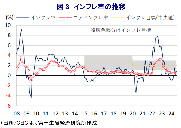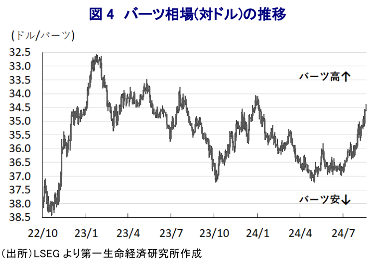 政府は今年の経済成長率見通しを+2.3~2.8%に修正し、年後半は内需をけん引にした景気底入れが進むとみている模様である。内需喚起を目的とする現金給付策などの効果は期待される一方、異常気象による食料インフレなどインフレ懸念がくすぶるほか、米ドル高一服で底入れするバーツ相場も外部環境如何で変化し得る。当研究所は今年の経済成長率見通しを政府見通しの下限(+2.3%)に留まると予想しており、ペートンタン新政権にとっては船出早々から様々な難題に直面することは避けられないと見込まれる。