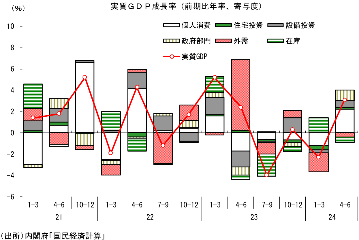 このように、4-6月期の成長率は自動車要因による反動増により押し上げられている面が大きく、この点は割り引いてみる必要がある。実際、自動車による攪乱を均してみるために24年1-6月期と23年7-12月期の実質GDPの水準を比較すると▲0.2%にとどまるほか、実質GDPを前年比で見ても、1-3月期が▲0.9%、4-6月期が▲0.8%と2四半期連続のマイナスである。今回の前期比での高成長をもって景気に強気になるには至らない。24年前半の景気は足踏み状態だったと判断するのが妥当だろう。