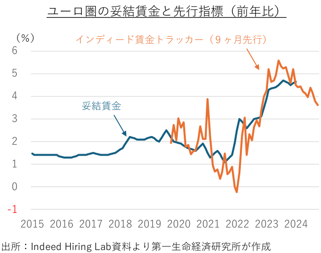 この間、ユーロ圏の消費者物価の上昇率は、エネルギー価格や食料品価格の押し上げ剥落に伴い、上昇率の鈍化が進んできた。ヘッドラインのインフレ率、変動の大きいエネルギーや食料などを除いたコア物価ともに、前年比2%台後半で推移している。一時金の支給タイミングなどによる振れもあるが、高インフレが遅れて反映されてきた賃金も、緩やかな鈍化傾向にある。中期的な物価安定の達成には、高止まりするサービス物価や賃金の上昇率が一段と鈍化する必要がある。