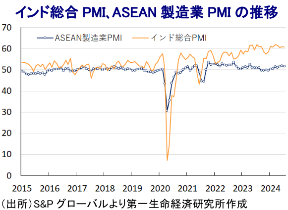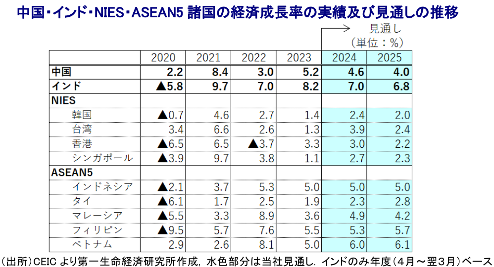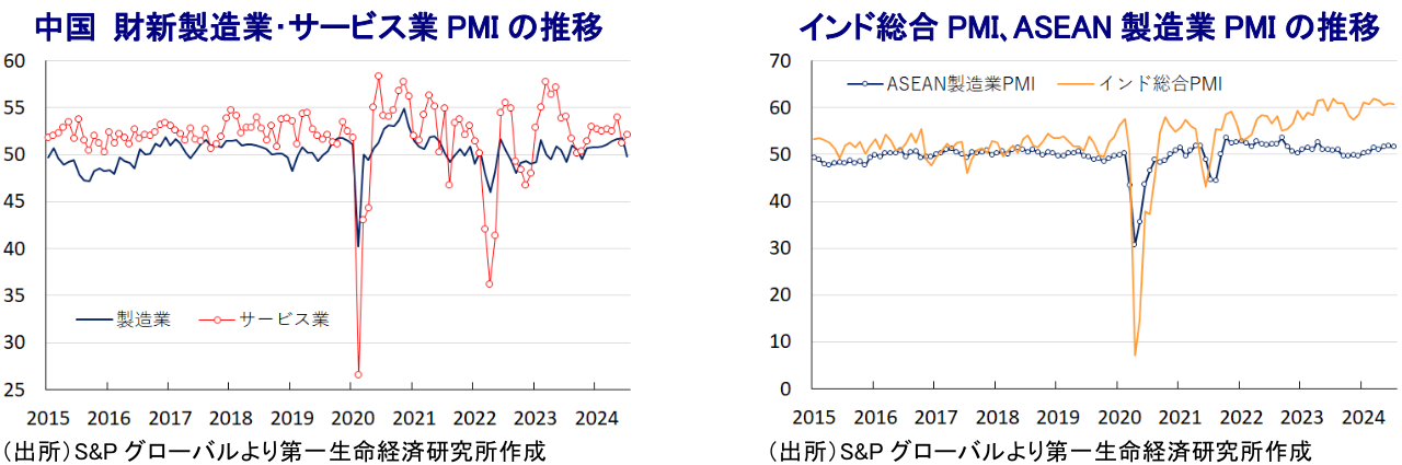 他方、経済の外需依存度が比較的高い上、中国経済への依存度が相対的に高いASEANやNIEs諸国においては、引き続き中国景気の同行に揺さぶられる展開が続くことは避けられない。他方、米中摩擦や世界的な分断の動きを追い風とするサプライチェーン見直しの動きは、生産拠点の受け入れに向けた対内直接投資を押し上げており、先行きにおいてもこうした動きが景気を下支えすることが期待される。また、昨年以降の各国のインフレは比較的落ち着いた推移をみせているものの、異常気象による食料インフレに加え、中東情勢の不透明感を受けた国際原油価格の高止まりなど生活必需品を中心にインフレ圧力がくすぶるなかで実質購買力の重石となる展開が続いている。足下の国際金融市場では米ドル高の動きに一服感が出ており、多くのアジア新興国通貨は底入れの動きを強めるなど輸入インフレの懸念は大きく後退している。一部の国は景気下支えを目的とする金融緩和に舵を切る動きをみせるが、先行きは米FRB(連邦準備制度理事会)をはじめ主要国中銀の動き次第の展開が続くと見込まれる。よって、当面の景気は公的需要への依存を強める様相が続くと考えられる。