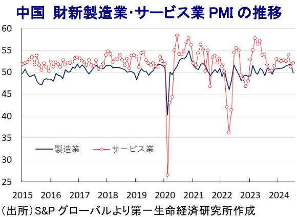 年明け直後の中国経済は、若年層を中心とする雇用回復の遅れや不動産市況の低迷によるバランスシート調整圧力が家計消費をはじめとする内需の足かせとなるなか、外需への依存度が高まるとともに、供給サイドをけん引役に景気底入れの動きを強める様相をみせてきた。しかし、コロナ禍からの世界経済の回復をけん引してきた欧米など主要国景気の勢いに陰りが出るとともに、欧米などは中国の過剰生産が需給環境の混乱を招くほか、経済安全保障上の脅威になることを警戒して対中姿勢を硬化させる動きをみせている。当局は地方政府による不動産在庫の買い取りや需要喚起を目的とする金融緩和、規制緩和のほか、内需喚起を目的とする買い替え促進策などの対応を強化する動きをみせている。しかし、足下では不動産市況の調整の動きに歯止めがかからず、雇用不安も重なり家計部門は財布の紐を固くしており、内需は勢いを取り戻せない状況が続いている。よって、4-6月の実質GDP成長率は前年同期比+4.7%に鈍化しており、前期比年率ベースでも+2.8%と6四半期ぶりとなる低成長となるなど頭打ちの動きをみせている。今春の全人代において当局は今年の経済成長率目標を「5%前後」としたが、年前半時点の成長率は前年比+5.0%とこれをクリアしているものの、名目成長率は同+4.1%と名実逆転状態が続くなどデフレ圧力がくすぶる状況は変わっていない。
