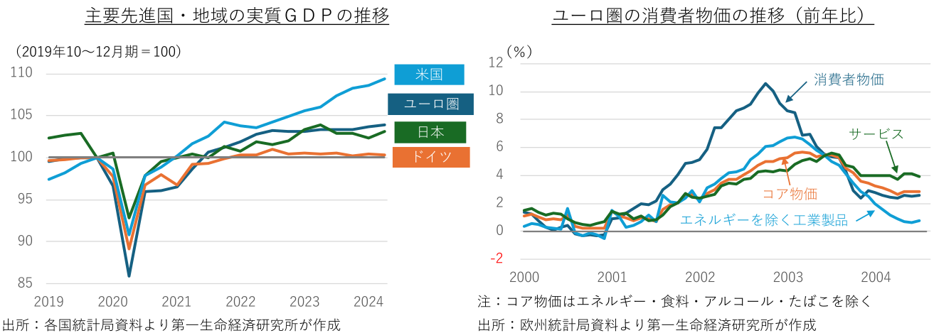 歴史的な高インフレによる家計消費への打撃、累次の利上げによる金融引き締めの効果浸透、世界経済の停滞による輸出低迷などが響き、2022年10~12月期から2023年10~12月期にかけて、ユーロ圏経済はほぼゼロ成長での足踏みが続いてきたが、2024年入り後はプラス成長に復帰している。景気回復を主導しているのは、旅行需要の回復やインフレ沈静化に後押しされたサービス部門が中心で、海外経済の停滞持続や先行き不透明感を背景に製造業部門の不振は続いている。