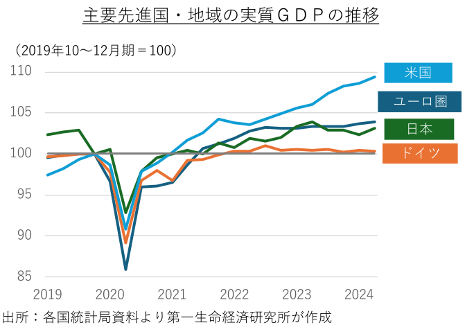 米国では、24年4-6月期の実質GDP成長率(1次推計)は、個人消費や設備投資の加速のほか、在庫投資の押し上げ等により、前期比年率+2.8%(前期同+1.4%)と加速した。