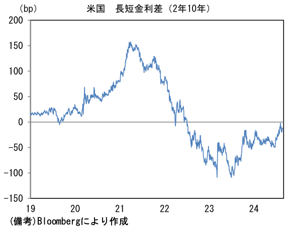 市場参加者の視線は、利下げの最終到達点(下方ターミナルレート)に移っている。FF金利先物は2025年終盤から2026年初までに3%近傍まで低下することを織り込んだ水準にあり、Fedが推計する中立金利である2.75%に近い水準となっている。年内に100bp(25bpを4回)、2025年に125bp強(同5回強)の利下げが現時点で想定されているようだ。景気後退を前提にするならば、中立金利近辺或いはそれ以下への引き下げは十分に考えられるが、インフレ体質が残存するならそうした見方は修正を迫られることになる。