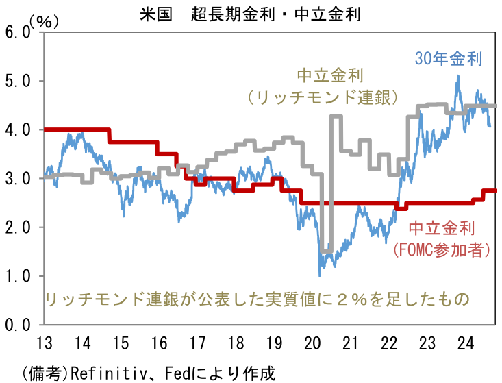 また推計方法によって異なる値が示されていることも認識しておく必要があるだろう。例えばリッチモンド連銀が推計するモデルによれば、名目中立金利は4%半ば(実質均衡金利2.5%+中長期インフレ率+2.0%)であるとされている。景気後退を前提にしないのであれば、Fedの利下げ余地は1.0%程度となることから、現在の市場金利はこちらのモデルが正しいと解釈しているようにもみえる。