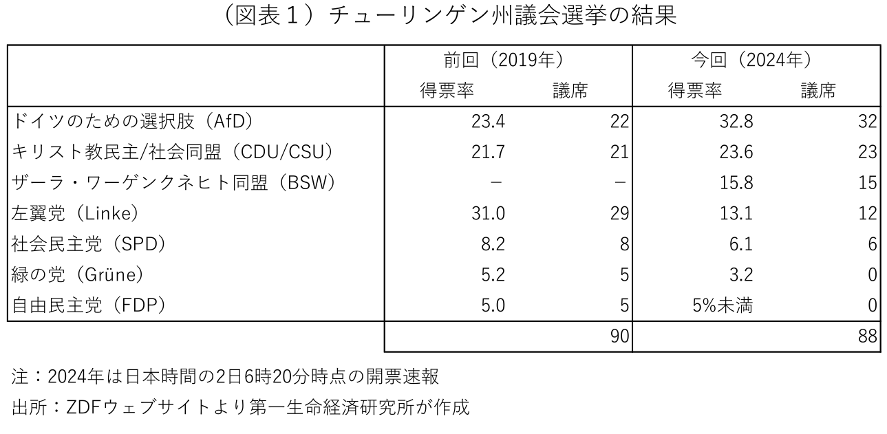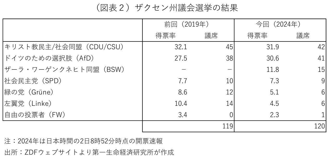 現地メディアの開票速報によれば、AfDはチューリンゲン州で33.2%の票を獲得し、CDUの23.6%を上回った(図表1)。極右政党が州議会の最大勢力となるのは、第二次世界大戦後のドイツで初。BSWが15.8%で三番手につけた。SPDは6.1%で議席獲得に必要な5%を辛うじて上回ったが、緑の党とFDPは5%に届かなかった。これまで州政府を率いてきた左翼党は、BSWやAfDに支持を奪われ、13.1%で四番手に沈んだ。ザクセン州では、CDUが31.9%で辛うじて首位を守ったが、AfDが30.6%の票を獲得、BSWが11.8%で三番手につけた(図表2)。SPDが7.3%、緑の党が5.1%で議席を死守したが、FDPが議席を獲得できなかった。