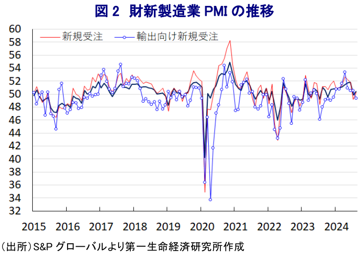 このところの中国景気を巡っては、若年層を中心とする雇用回復の遅れや不動産市況の低迷などの影響で幅広く内需が力強さを欠くなかで、外需への依存度を強めてきた。しかし、足下では欧米などが中国国内の過剰生産能力を背景とする供給拡大が経済安全保障上の問題を招くとして、追加関税を課すなど警戒を強める動きをみせている。さらに、割安な中国製品があふれることによる『デフレの輸出』が自国産業に悪影響を与えることを警戒して、インドネシアやベトナム、タイなど東南アジア諸国が追加関税や不当廉売調査に動くなど外需にも不透明感が高まっている。このように内・外需双方に不透明要因が山積しており、当局による補助金政策などを追い風にした過剰生産能力を抱える製造業企業を取り巻く環境は厳しさを増している。こうした状況を反映して、政府(国家統計局)が公表した8月の製造業PMI(購買担当者景況感)は49.1と4ヶ月連続で好不況の分かれ目を下回る水準で推移しており、前月(49.4)から▲0.3pt低下するなど一段と頭打ちしている。足下の生産動向を示す「生産(49.8)」は前月比▲0.3pt低下して6ヶ月ぶりに50を下回る水準に転じるなど生産活動が下振れしているほか、先行きの生産活動に影響を与える「新規受注(48.9)」も同▲0.4pt低下して4ヶ月連続で50を下回るとともに、「輸出向け新規受注(48.7)」は同+0.2ptとわずかに上昇するも4ヶ月連続で50を下回るなど、内・外需双方で受注動向は力強さを欠く推移をみせている。生産活動の低迷を受けて「購買量(47.8)」は前月比▲1.0pt、「輸入(46.8)」も同▲0.2pt低下しており、原材料に対する需要が下振れするなど中国向け輸出に依存するアジアをはじめとする新興国経済の足かせとなることが懸念される。他方、中国の景気減速懸念の高まりが商品市況の足かせとなっていることを反映して「購買価格(43.2)」は前月比▲6.7ptと大幅に低下するなどインフレ圧力が後退する動きがみられるほか、川上段階でのインフレ圧力の後退に加え、家計部門の財布の紐の固さが強まっていることを受けて「出荷価格(42.0)」も同▲4.3pt低下しており、ディスインフレ圧力の根強さを示唆する動きもみられる。そして、減産圧力が強まっていることを反映して「雇用(48.1)」も前月比▲0.2pt低下して一段と調整圧力が強まっている様子がうかがえるなど、雇用環境を巡る不透明感が家計消費の足かせとなる展開が続く可能性は高まっている。