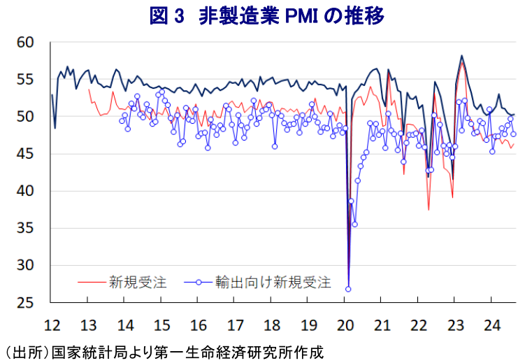 また、製造業に対して比較的堅調な動きをみせてきた非製造業PMIは50.3とわずかに上昇したが、異常気象や不動産需要低迷の影響で建設業のマインドはコロナ禍直後以来の低水準となっている。対照的にサービス業に堅調さがうかがえるが、受注動向は力強さを欠き、ディスインフレ圧力の根強さもうかがえる。雇用調整圧力が強まる上、不動産市況の一段の下振れも見込まれるなど、先行きの景気は不動産不況が足かせとなる状況が続くとともに、当局による政策対応に依存した展開で推移することが見込まれる。