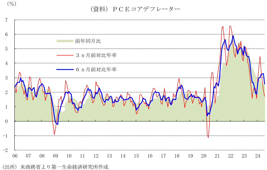 今後、景気が減速するなかで、PCEコアデフレーターは前年比で一旦上昇した後、+2%台前半に向けて低下するとみられる一方、失業率は上昇する可能性があり、労働市場の更なる軟化を回避するために、FRBは漸進的な利下げを継続する公算が大きい。FRBは、24年11月から25年後半にかけて、毎会合25bpの利下げを実施し、FFレート誘導目標を3.5%程度に引き下げると予想される。